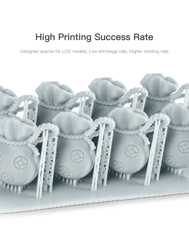 Γρήγορη σκλήρυνση Υπό την προϋπόθεση της διασφάλισης της αντοχής και της ακρίβειας των μοντέλων, η Standard Rigid Resin Plus συντομεύει το χρόνο έκθεσης και σκλήρυνσης και αυξάνει αποτελεσματικά την ταχύτητα εκτύπωσης. Υψηλή αντοχή και υψηλή ανθεκτικότητα Η Creality Standard Resin Grey είναι ειδικά σχεδιασμένη για LCD 3D Printer, με χαμηλότερο ποσοστό συρρίκνωσης και υψηλότερο ρυθμό μορφοποίησης. Σε σύγκριση με την παραδοσιακή άκαμπτη ρητίνη, η Creality Standard Rigid Resin Plus έχει καλύτερες επιδόσεις, με αντοχή σε κάμψη 90-95 Mpa και αντοχή σε tensile strength 60-68 Mpa. Ευρεία συμβατότητα, ευρεία εφαρμογή Η Creality Standard Rigid Resin Plus είναι συμβατή με τους περισσότερους LCD/DLP 3D Printers της αγοράς και μπορεί να εφαρμοστεί σε διάφορους τομείς, όπως κινούμενα σχέδια, διακόσμηση σπιτιού, εκπαίδευση, αρχιτεκτονική κ.ο.κ. Φωτεινά και ζωντανά χρώματα Μετά τη χρήση της Creality Standard Rigid Resin Plus, τα χρώματα των εκτυπωμένων μοντέλων είναι φωτεινά και ζωντανά και τα είδη των χρωμάτων είναι διάφορα, καλύπτοντας τις διαφορετικές ανάγκες εκτύπωσης των χρωμάτων σας.