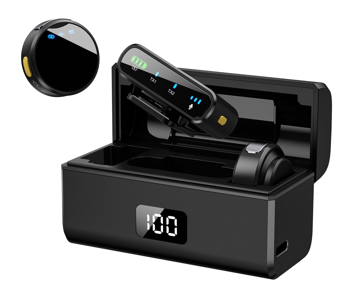 Εξοπλίζονται με θήκη φόρτισης, για την αποθήκευση, προστασία και επαναφόρτιση των μικροφώνων, η όποια επαναφορτίζεται μέσω θύρας USB-C.